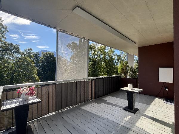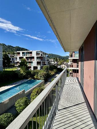 Die Raumhöhe von 280 cm und raumhohe Fenster sorgen für ein außergewöhnlich helles Wohnambiente und eröffnen von allen Räumen den direkten Zugang zum großzügigen Rundum-Balkon. Hier genießen Sie morgens die Sonnaufgänge mit Blick Richtung Traunstein und abends die Sonnenuntergänge mit Blick Richtung Park und Poolanlage sowie einen unvergleichlichen Blick in die Natur und den majestätischen Traunstein.